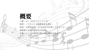 技能:音楽演奏技能(片方は必ず所持していること)、他探索に必要と思われる技能